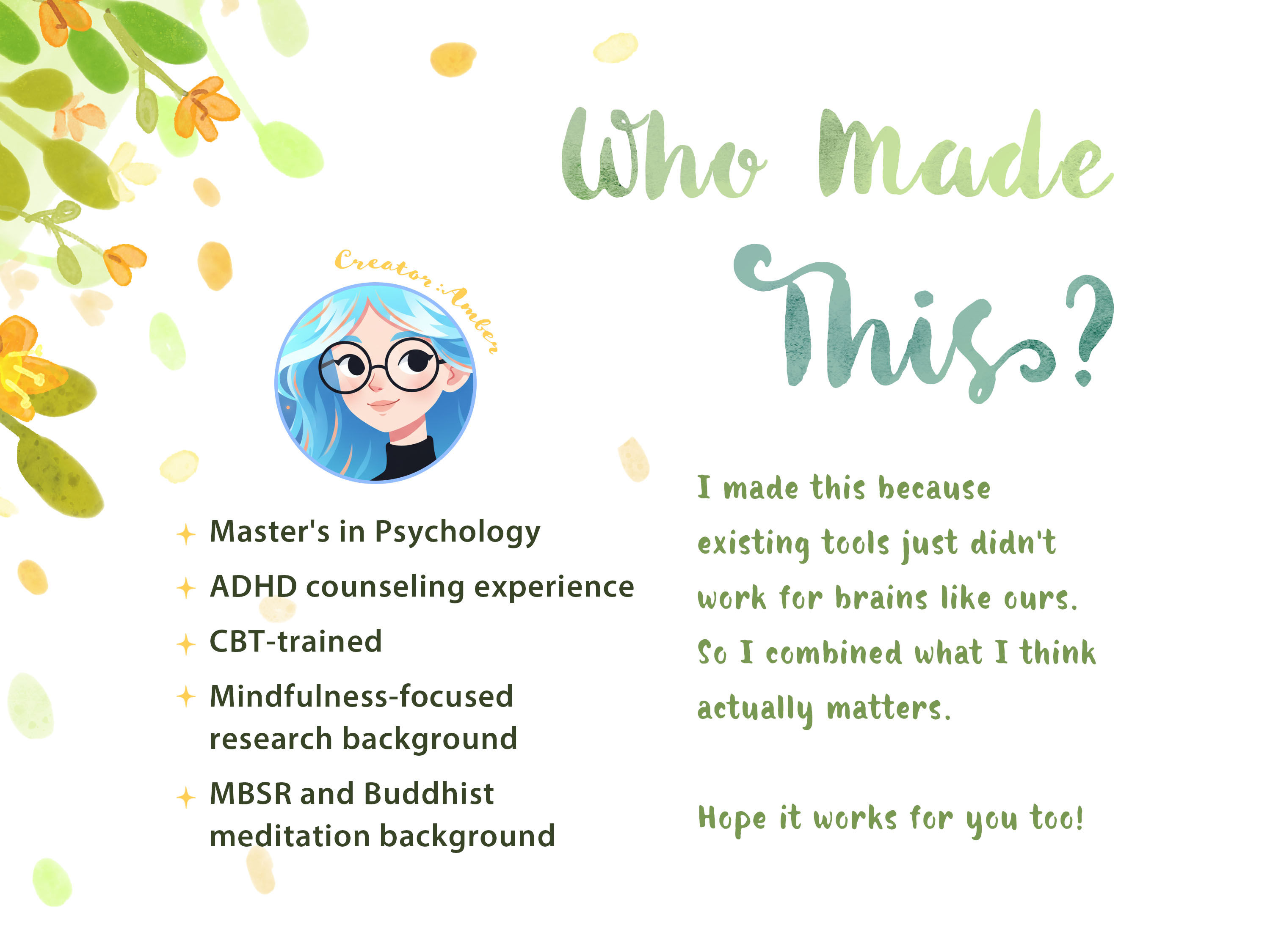 Hi, I'm Amber. Spent years doing counseling work, now making things I love. wayADHD is where I create the tools I always wished existed (for both me and others!). Mental health experience meets design obsession. I put a lot of heart into this. Hope it helps.